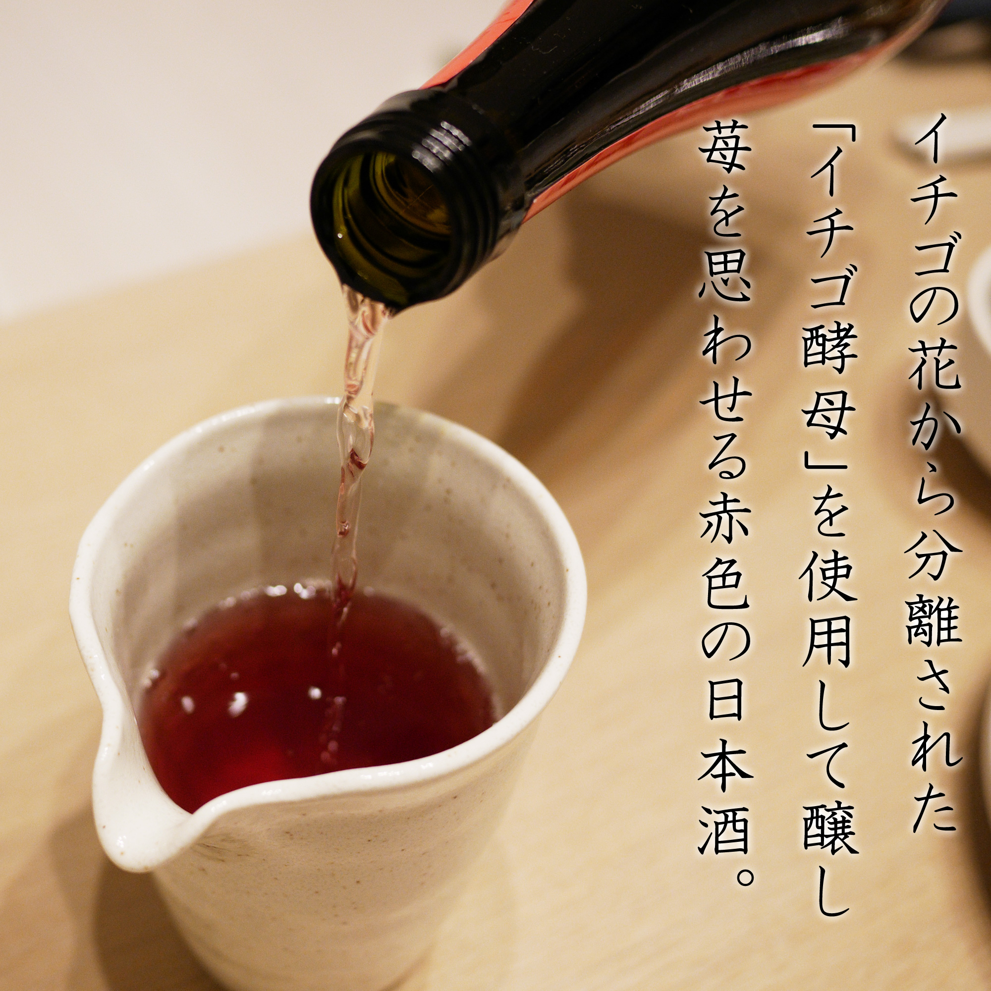 東京農大短期大学部醸造学科でイチゴの花から分離された「イチゴ酵母」を使用して醸し、苺を思わせる赤色に仕上げた、リンゴ酸の爽やかさが特長の美味しい日本酒です。